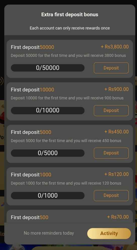 - First deposit 500 PKR, receive 70 PKR bonus.
